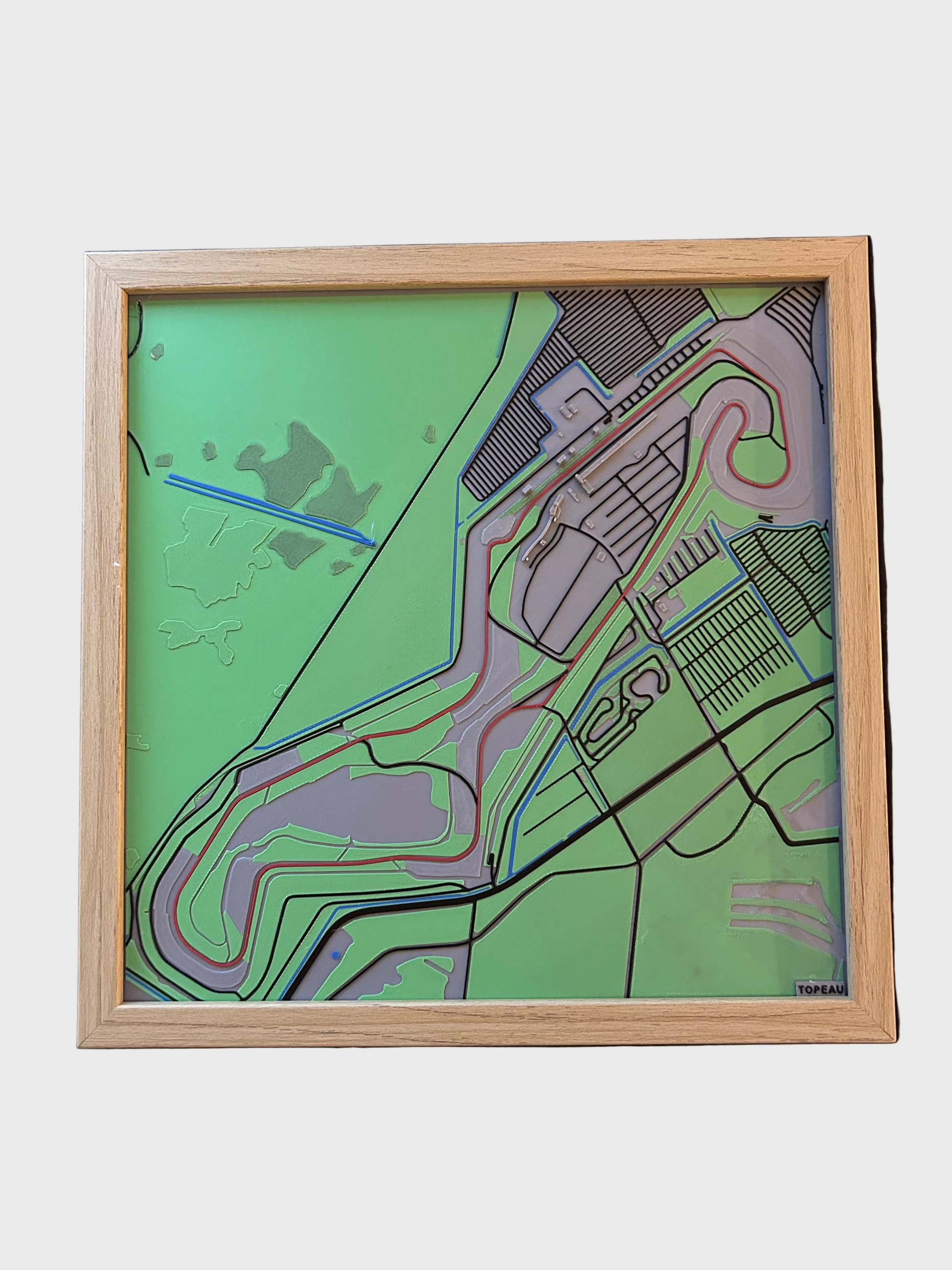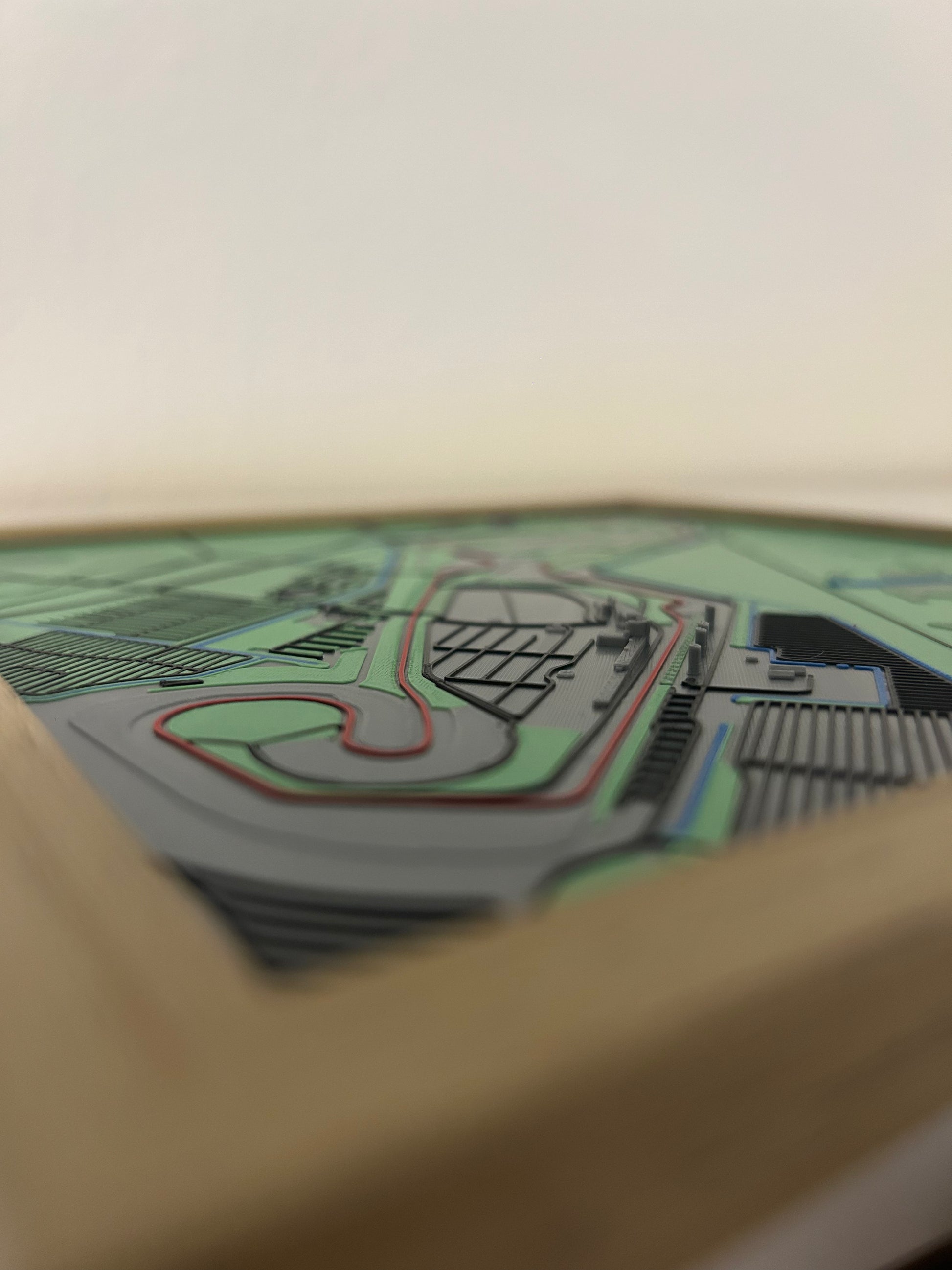 Breng de legendarische snelheid van het TT Circuit Assen in huis met dit unieke 3D-geprinte kunstwerk! Deze uitzonderlijk gedetailleerde plattegrond van 20x20 cm transformeert het iconische "Cathedral of Speed" in een tastbaar, modern reliëfschilderij. Elke bocht, elk rechte stuk en zelfs de pitstraat is met precisie vastgelegd, wat zorgt voor een fascinerend perspectief op het circuit vanuit vogelvlucht.